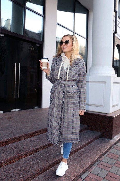 Пальто женское легкое без подкладки под съемный пояс, прямого силуэта, воротник отложной с лацканами, рукав на спущенной пройме, по переду накладные карманы, края борта и низ изделия отделан бахромой из той же ткани.