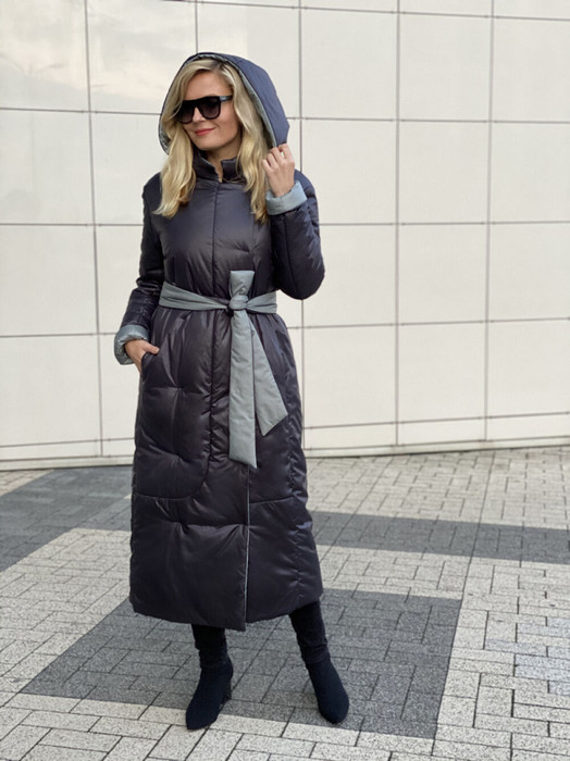 Пальто женское, стеганное из плащевой ткани на утеплителе нового поколения isosoft (Пальто 250 г/м2, рукав 200 г/м2). Прямого силуэта, удлиненное под пояс из той же ткани, 2-стороннее, 2-цветное, с отстегивающим капюшоном на молнию. Рукав втачной на спущенной пройме с отложной манжетой по низу, воротник – стойка, застежки спереди на кнопки, 2-бортное, по переду в швах – карманы и рельефы, закругленные к нижней части изделия