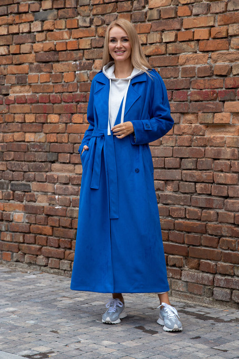 Пальто женское демисезонное из пальтовой ткани, прямого силуэта, свободное, удлинённое, двубортное, под съёмный пояс, воротник отложной, рукав покроя "реглан" с патами, по переду карманы, по спинке- кокетка с пуговицей, изделие на подкладке.