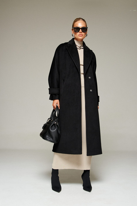 Пальто выполнено из шерстяной ткани, которая обеспечивает теплоизоляцию и защиту от ветра и влаги, подходит для межсезонья и теплой зимы. Двубортное, на подкладке.  Изделие рассчитано на температурный режим от +10 до -5 градусов. Модель прямого силуэта актуального покроя «летучая мышь»; предназначена для повседневного использования.