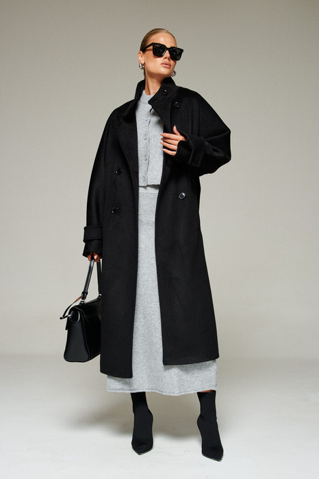 Пальто выполнено из шерстяной ткани, которая обеспечивает теплоизоляцию и защиту от ветра и влаги, подходит для межсезонья и теплой зимы. Двубортное, на подкладке.  Изделие рассчитано на температурный режим от +10 до -5 градусов. Модель прямого силуэта актуального покроя «летучая мышь»; предназначена для повседневного использования.