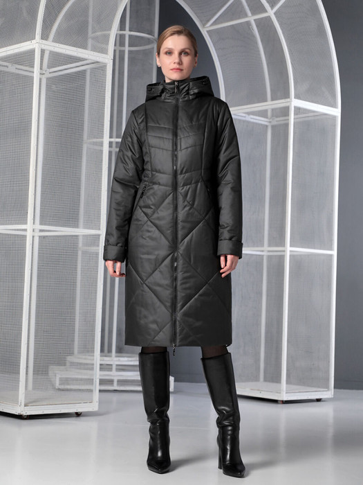 Пальто средней длины полуприлегающего силуэта с застежкой на двухзамковую молнию, обеспечивающую удобство при ходьбе.  Воротник - стойка, переходящая в регулируемый капюшон.  Удобно расположенные прорезные карманы застегиваются на молнию. Есть внутренний кармашек, тоже на молнии. Длину втачного рукава можно регулировать посредством отворота. При желании можно с помощью кулиски менять ширину изделия по линии низа. Модель такого пальто с контрастной фурнитурой и внутренней отделкой практична и подходит для девушек и женщин разных возрастных категорий. Плащевая ткань имеет водоотталкивающую пропитку,  выдержит небольшой осенний дождь. Хорошо зарекомендовавший себя утеплитель Холлофайбер плотностью 150 гр\м  защитит от холода и  ветра.