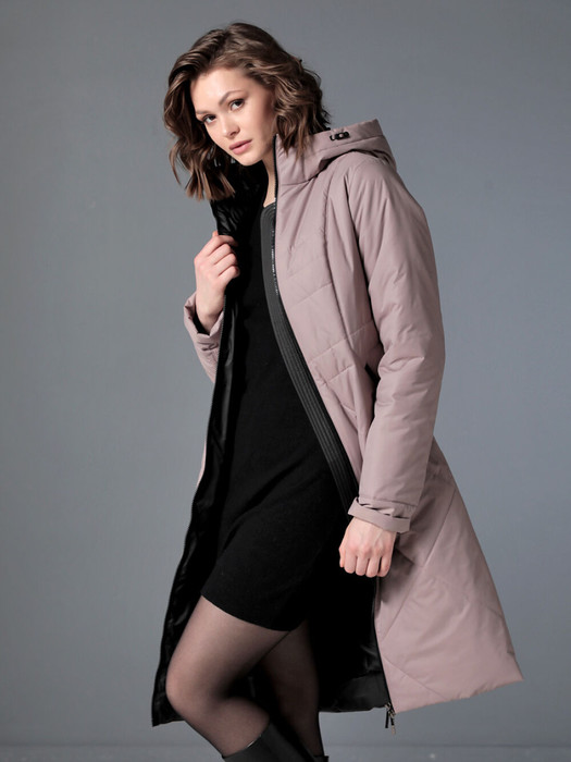 Пальто средней длины полуприлегающего силуэта с застежкой на двухзамковую молнию, обеспечивающую удобство при ходьбе.  Воротник - стойка, переходящая в регулируемый капюшон.  Удобно расположенные прорезные карманы застегиваются на молнию. Есть внутренний кармашек, тоже на молнии. Длину втачного рукава можно регулировать посредством отворота. При желании можно с помощью кулиски менять ширину изделия по линии низа. Модель такого пальто с контрастной фурнитурой и внутренней отделкой практична и подходит для девушек и женщин разных возрастных категорий. Плащевая ткань имеет водоотталкивающую пропитку,  выдержит небольшой осенний дождь. Хорошо зарекомендовавший себя утеплитель Холлофайбер плотностью 150 гр\м  защитит от холода и  ветра.