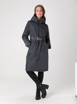 Длинное демисезонное пальто полуприлегающего силуэта с втачными рукавами и разрезами по бокам. Застежка на двухзамковую молнию позволяет расстегнуть пальто как сверху, так и снизу, что актуально при такой длине изделия для корректировки ширины шага и при  подъеме по лестнице. Воротник - стойка, переходящая в капюшон. Прорезные карманы с декоративными лИсточками удобно расположены в рельефных швах. При желании линию талии можно акцентировать съемным эластичным поясом на защелке.  Плащевая ткань имеет водоотталкивающую пропитку, которая выдержит небольшой осенний дождь или снег. Хорошо зарекомендовавший себя утеплитель  Холлофайбер, плотностью 150 гр/м, защитит от холода и  ветра. Подкладка в изделии выполнена из качественной ткани точно в цвет верха. Фантазируйте с аксессуарами, и Ваша осень будет стильной и комфортной!