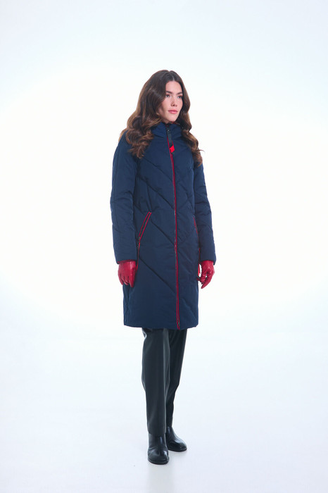 Пальто женское плащевое утепленное, стеганное на утеплителе ISOSOFT 250гр. прямого силуэта, на подкладке, с капюшоном, длиной ниже колена. Застежка на молнию. Перед с наклонными карманами, застегивающиеся на молнию. По борту и карману отделочный кант. Рукав втачной, двухшовный.
