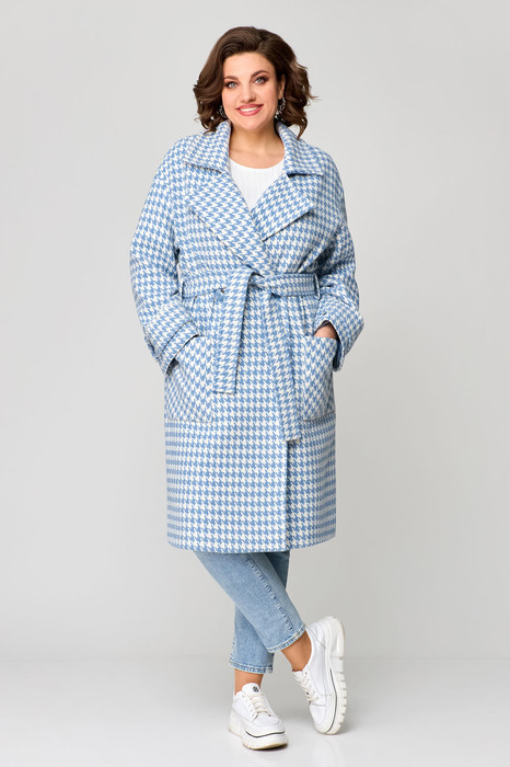 Пальто женское двубортное прямого силуэта, длиной чуть ниже колена. Воротник отложной с лацканами. По переду накладные карманы. Линия плеча спущена. Рукав втачной, по низу пата с пуговицей. Застежка на две петли и пуговицы и потайную пуговицу. На правой половине переда расположены две отделочные пуговицы симметрично петлям. Спинка со средним швом по низу шлица. Изделие на подкладке.