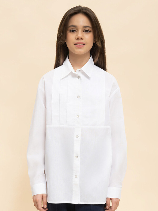 Школьная блузка для девочки свободного кроя. Блузка детская с классическим отложным воротничком. Удобная центральная застёжка на кнопки, имитирующие пуговицы — ребёнок легко и быстро застегнёт и расстегнёт. Фишка модели — глубокие складки, заложенные в верхней части переда. — стильная деталь, выгодно отличающая эту модель от банальных однотонных блузок. В составе ткани преобладает качественный хлопок — блузка в школу для девочки мягкая, воздухопроницаемая и комфортная для ребёнка. Полиэстер помогает не терять форму и отличный внешний вид — изделие прослужит не один сезон. Для школьных рубашек мы используем сорочечную ткань, плотностью 100гр/м2. Школьная блузка лаконичного дизайна, без принта, её легко сочетать с различными брюками, юбками, сарафанами. Красивая и практичная блузка белая для девочки — подходит как для повседневной носки, так и для более торжественных случаев. Помните о правильном уходе за изделием: рекомендуется стирать при температуре не выше 30 °C, без предварительного замачивания, с изнанки. Это поможет сохранить качество и цвет блузки на долгое время.