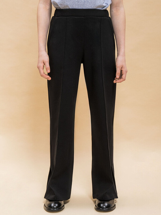 Трикотажные брюки прямого силуэта. Пояс на резинке по спинке с дополнительной встроенной утяжкой на резинку с петельками. По переду боковые карманы и застрочены стрелки. Имитация застежки, гульфика. По правой спинке имитация прорезного кармана с листочкой. По низу изделия в боковых швах располагаются шлицы
