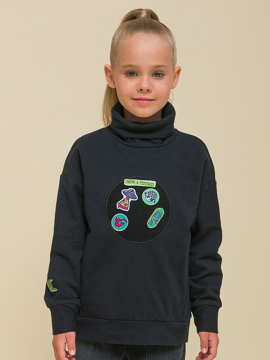 Водолазка детская для девочки. Лонгслив модного оверсайз-силуэта со спущенным плечом подарит ребёнку комфорт и свободу движений. Джемпер с воротником-стойкой. Его можно носить двумя способами: в два сложения — как у классической водолазки — и без отворота — актуально, стильно. По переду оригинальные рельефы, в которых прячутся карманы. По низу изделия пояс из основной ткани. На рукавах манжеты, также из основной ткани. На них есть отверстия для большого пальца — можно носить как митенки или как обычные манжеты. Модель неприхотлива в уходе. В составе ткани (футер с начёсом) преобладает качественный хлопок — джемпер мягкий и отлично пропускает воздух, давая коже ребёнка дышать. Эластан помогает изделию сохранить прекрасную форму надолго. Водолазка с оригинальным декором — «собери принт». Патчи на велькро (липучке) можно складывать в аппликации по своему желанию — такая необычная возможность творчества порадует ребёнка! В наборе несколько рисунков и надписей, надписи переводятся: «создай свой день!», «хватай пиццу!» Водолазка детская выполнена в классическом чёрном цвете, её легко сочетать с любыми брюками, джинсами, легинсами. Размерный ряд: 1 (86); 2 (92); 3 (98); 4 (104); 5 (110); 6 (116). Водолазка с принтом станет отличным дополнением гардероба для маленьких девочек дошкольного возраста. Её можно носить в детский сад, на прогулки, отдых, а также дома. Водолазка с длинным рукавом подходит для круглогодичного применения: летом, осенью, зимой, весной и демисезон. Отличный подарок дочери, внучке или сестре на Новый год и любой другой праздник.