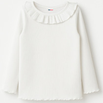 Трикотажная блузка для девочек умеренного объёма, выполнена из эластичного хлопкового материала с коротким рукавом. Новым элементом в блузке является большой плосколежащий воротник фигурной формы, декорированный рюшей по внешнему краю, выполненный из отделочной швейной ткани. Удобство надевания изделия через голову обеспечивается спроектированной спереди планкой из швейного полотна с застежкой на пуговицы. Нижний край планки вшит в кокетку переда.  Сзади под воротником пришита узкая декоративная репсовая тесьма, которая завязывается спереди на бантик под воротником.