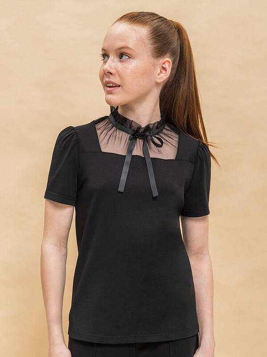 Джемпер из мягкого хлопкового трикотажа с небольшим содержанием эластана, полуприлегающего силуэта с декоративной вставкой и рюшей по горловине из мягкой тонкой сетки. На горловину настрачивается репсовая лента, имитирующая миниатюрную стойку, на переде которой завязанный бант. По спинке застежка на пуговицу.