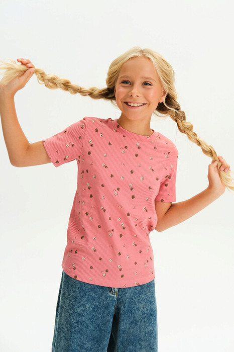 Очаровательная футболка для девочки из трикотажа кашкорсе — мягкая, эластичная и приятная к телу. Ткань в рубчик отлично тянется, сохраняет форму и обеспечивает комфорт на весь день.