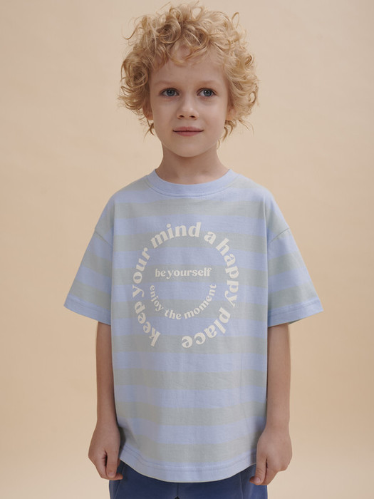 Модель представлена в голубом цвете с нюансной полоской. Красивый вариант на любой выход. Футболка для мальчика с принтом украшена надписью "Keep your mind a happy place be yourself enjoy the moment" – перевод "Держи свой разум в хорошем месте будь собой наслаждайся моментом". Изделие оформлено широкой горизонтальной полоской. Футболка для мальчика подростковая рассчитана на возраст садика и школы. Размерная линейка: 1 (86); 2 (92); 3 (98); 4 (104); 5 (110); 6 (116); 7 (122); 8 (128); 9 (134); 10 (140); 11 (146).