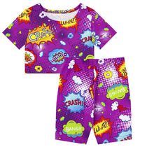 Комплект для девочек туника и лосины. Туника А силуэта с мягким спущенным плечом очень свободного силуэта. Асимметричный низ туники подчеркнут красивым воланом. Фольгированный голографический принт с неоном. Лосины из эластичного трикотажа.