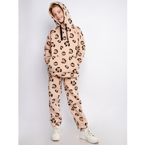 Комплект для девочек туника и лосины. Туника из футера с рукавами реглан из велсофта. На переде рельефные швы, создающие силуэт лёгкий бочонок. В швах рукава вшиты декоративные ушки, расшитые золотистыми пайетками. По переду принт из мягких стойких золотых сердечек и вышивки из пайеток, имитирующие мордочку медведя. Лосины из эластичного футера с начесом.