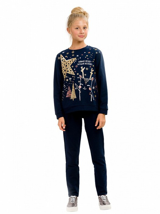 Комплект для девочек: толстовка и брюки. Комплект из футера. Толстовка среднего объёма, со спущенным плечом. Центральный принт в необычной стилизованной графике с розовым золотом и золотой посыпкой, надпись "Поймай звезду - загадай желание!" уносит в сказочную атмосферу. Манжеты из основной ткани на рукавах и по низу изделия. Брюки слегка заужены к низу, регулировка объема по талии шнурком.