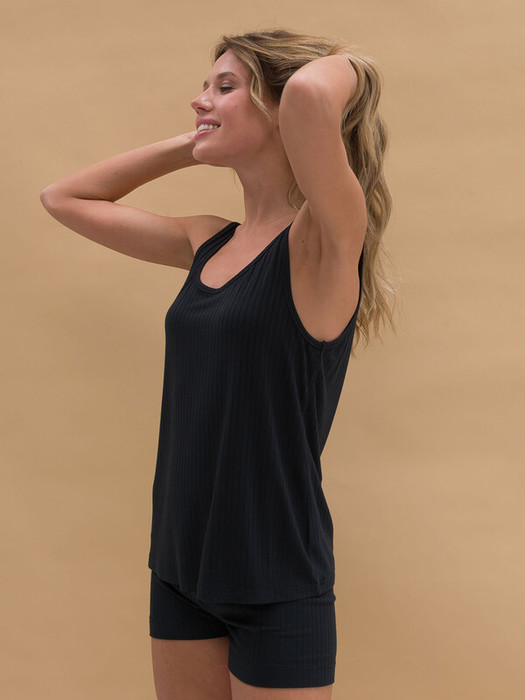 Женский костюм – майка и шорты из эластичной ткани в рубчик. Ткань отлично растягивается и быстро возвращается в исходную форму, приятна на ощупь и проста в уходе. Майка на широких бретелях свободного кроя с увеличенными проймами – стильная, спортивная, уютная. Обтягивающие короткие шорты на мягкой резинке из основной ткани – отлично сидят, акцентируют внимание на ногах. В костюме удобно спать, заниматься повседневными делами и просто быть собой.