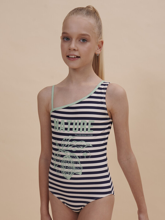 Модный слитный купальник для девочки. Модель с оригинальными ассиметричными лямками, они не сползают, исключают трение и раздражение. На узкой бретели сзади предусмотрена регулировка длины. Передняя часть изделия с подкладкой — не просвечивает. Детский купальник выполнен из полиамида и эластана — он прекрасно тянется, не теряя при этом своей формы, не выгорает и быстро сохнет. По переду модель декорирована красивым принтом в ботаническом стиле. На принте изображены какао-бобы. Надпись переводится:"природа". Принт мягкий и стойкий, не боится частых стирок. Купальник в тёмно-синюю горизонтальную полоску — такой узор в стиле тельняшки — один из самых трендовых в этом сезоне. В линейке есть детские купальники следующих размеров: 3 (98); 4-5 (104-110); 6-7 (116-122); 8-9 (128-134); 10-11 (140-146). Купальник красивый подходит для девочек дошкольного, младшего школьного возраста и девочек-подростков. Отличный вариант для летнего отдыха, пляжа, моря и бассейна. Модный купальник — чудесный подарок дочери, внучке или сестре на любой праздник. Выбирайте нужный размер по таблице размеров на фото. Цвет товара на экране вашего устройства может отличаться от цвета изделия вживую. Товар возврату и обмену не подлежит.
