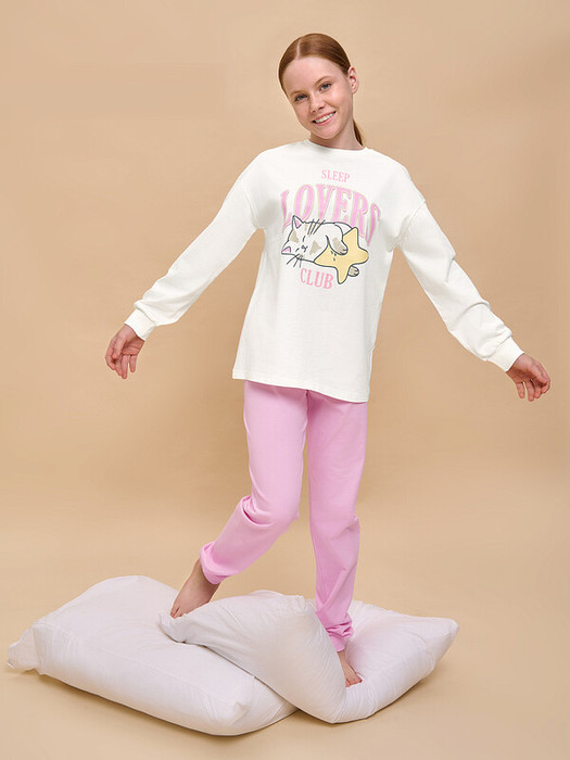 Детская пижама для девочки. Модель выполнена из 100% хлопка — идеальный вариант для детской пижамы. Комплект для сна мягкий, гипоаллергенный и хорошо пропускает воздух. В хлопковой пижаме ребёнку будет тепло, даже если он раскроется во время сна. Всё это способствует комфортному и качественному сну. Джемпер и брюки умеренного объёма, плечо немного спущено, рукава широкие и свободные — в пижаме очень удобно спать. В поясе брюк мягкая и широкая резинка — не перекручивается и не давит. Манжеты и отделка горловины из эластичной рибаны — они не растягиваются, пижаму удобно надевать и снимать. Хлопковая пижама украшена милым принтом в виде спящего котика, надпись переводится: «клуб любителей поспать» — понравится любой девочке. Детская пижама неприхотлива в уходе. Принт эластичный и мягкий, легко переносит частые стирки. Детская пижама с брюками подходит для сна как дома, так и в детском саду — отличный выбор для вашего ребёнка! Помните о правильном уходе за изделием: рекомендуется стирать при температуре не выше 30 °C, без предварительного замачивания, с изнанки. Это поможет сохранить качество и цвет пижамы на длительное время.