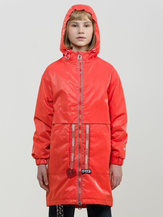 Утепленный плащ синтепон 40 г/м2 в рукавах, подклад из флиса в капюшоне, по стану и на внутреннем воротнике. Рекомендуемый температурный режим не ниже плюс 5 градусов. Силиконизированная ткань крэш с благородным матовым блеском. Водоотталкивающее покрытие. Прямой силуэт, по переду с декоративным горизонтальным членением чуть выше талии и легким плавным перепадом длин по низу изделия. Двухшовный неотстегивающийся капюшон с регулировкой объема, переходящий в воротник стойку. Изюминка большие накладные карманы и две принтованные репсовые ленты с оригинальными наконечниками, один из которых декорирован пайетками. По спинке широкий отлетной пояс со световозвращающим принтом, перевод Следуй за мной. Световозвращающие элементы вдоль застежки молнии.
