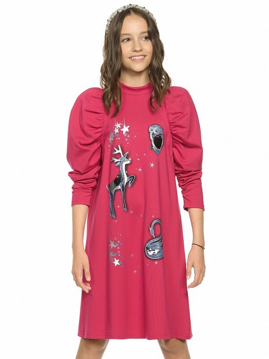 Нарядное платье, слегка расширенное к низу. Горловину украшает изящная стойка, застёжка на две пуговицы по спинке. Фишка платья в пышных рукавах, объём которых достигнут за счет густой сборки оката. Сборка рукава по внутреннему шву на эластик позволяет регулировать длину. Перед декорирован сказочным принтом с серебряным металликом и пайетками.