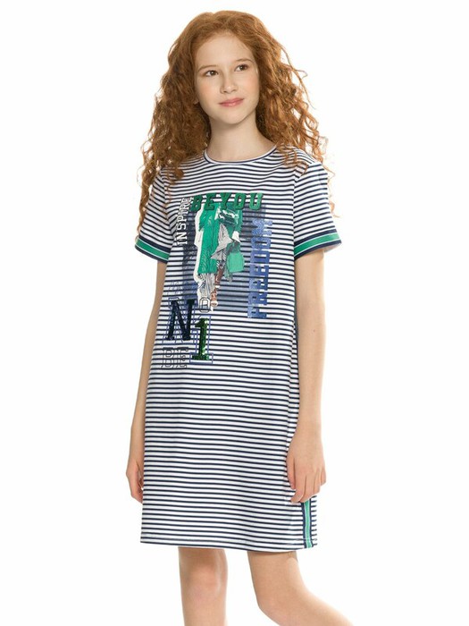 Платье из трикотажа в полоску свободного А-силуэта в стиле 60-ых. Небольшой объем в плечевой зоне, короткий втачной рукав. По боковым швам и низу рукава трикотажная декоративная тесьма. По центру изделия фотопринт с разноцветным глиттером и вышивкой переливающимися переворачивающимися пайетками. Перевод  Вдохновляй, Будь собой, Свобода, Мой стритстайл, Будь первой.