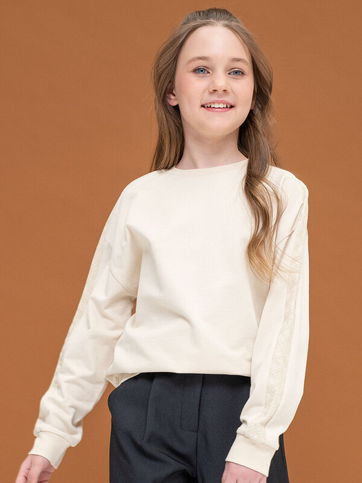 Модный свитшот из мягкого футера для девочки. 100% хлопок — ткань дышащая, тактильно приятная и комфортная для ребёнка. Объемный крой, спущенное плечо – настоящий трендовый оверсайз. Низ отделан рибаной — слегка собирает изделие, но не фиксирует на бедрах. Манжеты рукавов из рибаны — рукава не сползают, но в то же время есть запас по длине рукава. Модель декорирована изящными кружевными вставками вдоль плечевых швов и рукавов — это делает свитшот элегантным и женственным. Вставки не просвечивают, под ними подкладка из основного материала. Свободный силуэт позволяет брать этот свитшот на вырост — он будет словно «расти» вместе с ребёнком, долго не станет малым. Модный и практичный вариант красивой школьной одежды для девочек.