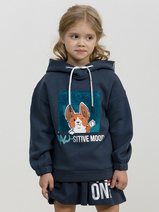 Худи из футера с начесом. Оригинальный капюшон с запахом, объем регулируется принтованными шнурками с пластиковыми наконечниками. По краю капюшона широкая обтачка с текстовым принтом из серебряного металлика. Перевод Не важно. Центральный принт в виде нашивки из двусторонних пайеток, серебряного и бирюзового металликов. Перевод игра слов PAW лапа и POSITIVE позитивное настроение.