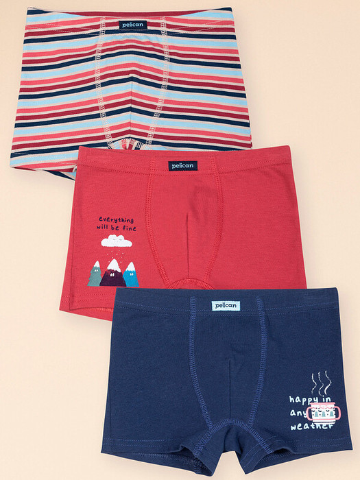 При выборе белья для своего ребёнка каждая мама хочет быть уверена в его качестве и в том, что ребёнку будет комфортно. Комплект (3 шт.) трусов для мальчика полностью соответствует этим запросам. В составе ткани преобладает хлопок — боксеры мягкие, великолепно пропускают воздух, позволяя коже ребёнка дышать. Благодаря эластану изделие сохраняет отличную форму в течение долгого времени. Качественный материал и правильный крой обеспечивают идеальную посадку на теле — ребёнку удобно на протяжении всего дня. Широкая и мягкая резинка в поясе не давит и не перекручивается. В комплекте представлены шорты трёх оттенков: бордовый, темно-красный и темно-синий. Все эти цвета смотрятся оригинально и понравятся любому мальчику. Одни боксеры — в уютную горизонтальную полоску, двое других украшены симпатичным принтом в стиле "хюгге". Перевод: "Счастлив в любую погоду. Все будет хорошо". Принты плотные и мягкие, прекрасно переносят многочисленные стирки. Трусы отлично подходят для повседневной носки, спортивных тренировок, о