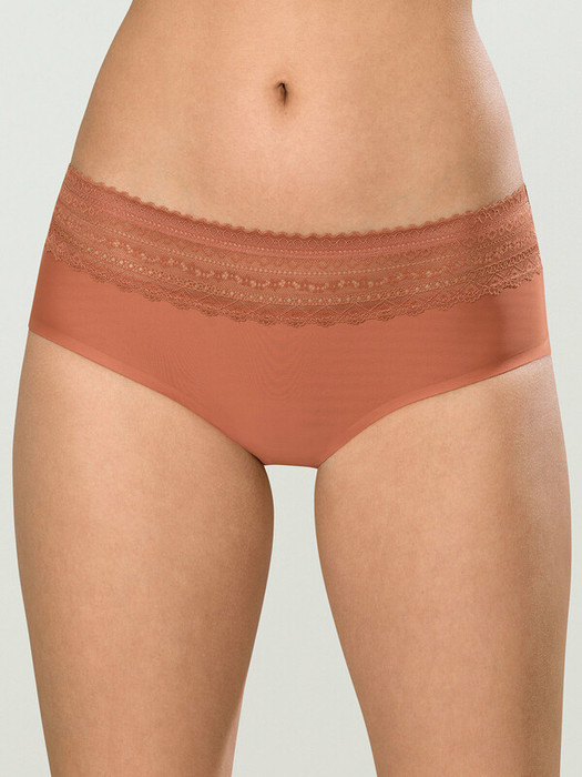 Женские трусы-шорты с низкой посадкой. Изготовлены по бесшовной технологии с минимум швов. Кромки по ноге и по талии подогнуты и приклеены, хлопковая приклеенная ластовица.  Нежное геометричное кружево по линии талии высотой 5 см – не передавливает тело и не натирает кожу.  Модель оценят те, кто ищет незаметное и невесомое белье на каждый день или особого случая.