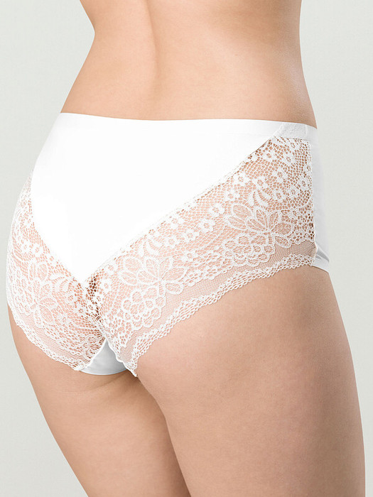 Женские трусы-шорты с высокой посадкой. Изготовлены по бесшовной технологии с минимум швов. Кромки по ноге и по талии подогнуты и приклеены, хлопковая приклеенная ластовица.  Нежное цветочное кружево придает модели утонченный вид. Продуманный крой трусов создает изящный силуэт. Модель оценят те, кто ищет незаметное и невесомое белье на каждый день или особого случая.