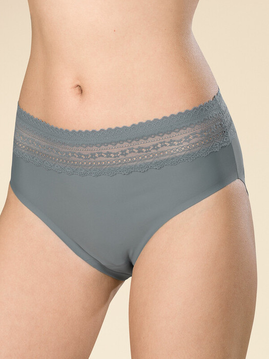 Женские трусы-слипы с высокой посадкой. Изготовлены по бесшовной технологии с минимум швов. Кромки по ноге и по талии подогнуты и приклеены, хлопковая приклеенная ластовица.  Нежное геометричное кружево по линии талии высотой 5 см – не передавливает тело и не натирает кожу.  Модель оценят те, кто ищет незаметное и невесомое белье на каждый день или особого случая.