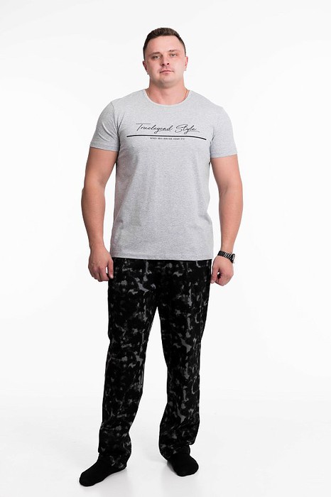 Мужская пижама выполнена из хлопкового полотна, состоит из брюк и футболки. Брюки с поясом на резинке, по бокам расположены карманы. Футболка однотонная, с коротким рукавом и круглым вырезом горловины, оформленным бейкой. Спереди нанесён принт.