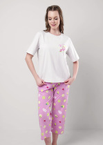 Пижама женская из гладкокрашеного трикотажного вискозного полотна с отделкой кружевом, состоящая из майки и брюк. Майка - свободного кроя, на широких двойных бретелях, с V-образным вырезом горловины. Полочка и спинка состоят из двух деталей с отрезной кружевной кокеткой. Проймы окантованы основным материалом.Брюки – свободные, средней длины, слегка зауженные книзу, с эластичной тесьмой по талии.