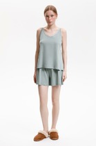 Пижама молодежная из гладкокрашеного трикотажного вискозного полотна, состоящая из топа и шорт. Топ - на узких бретелях, полочка – с лифом «бюстье», отделанным кружевом, в центре лифа – разрез, окантованный основным материалом. Основная деталь переда присборена по шву соединения с лифом. Верхний срез спинки и проймы окантованы основным материалом, бретели вытачаны из окантовки.Шорты – средней длины, с эластичной тесьмой по талии.