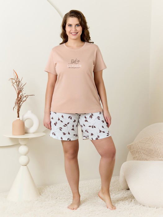 Пижама женская из трикотажного полотна «кулирка» в комбинации двух видовполотен: гладкокрашенного и с набивным рисунком, состоящая из футболки и шорт. Футболка женская из гладкокрашеного трикотажного полотна «кулирка», классического покроя, с короткими втачными рукавами, горловиной овальной формы, обработанной притачной бейкой из основного материала и принтом на полочке, выполненным в технике «шелкографии».Шорты – из полотна с набивным рисунком, удлиненные, свободного покроя, с эластичной тесьмой по талии.