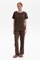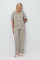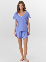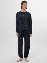 Пижама молодежная из трикотажного полотна «микрофлис» в комбинации двух видов: с набивным рисунком и гладкокрашеного в единой цветовой гамме, состоящая из футболки и брюк. Футболка - из гладкокрашенного полотна, классического покроя, с длинными втачными рукавами, горловиной овальной формы, окантованной основным материалом.Брюки – из полотна с набивным рисунком, свободного покроя, с эластичной тесьмой по талии и притачными манжетами по нижним срезам.