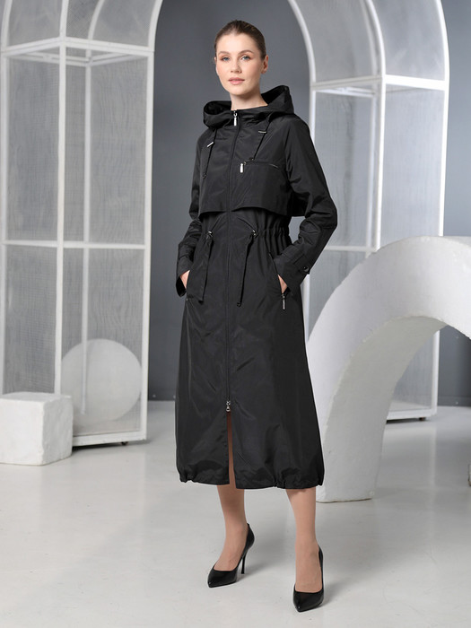 Длинный весенний плащ А-образного силуэта с рукавами покроя реглан и отлетными кокетками по спинке и полочке подойдет для женщин и девушек любого возраста. Застежка на двухзамковую молнию позволяет расстегнуть изделие как сверху, так и снизу, регулируя тем самым ширину шага при ходьбе и подъеме. Воротник - стойка, переходящая в регулируемый капюшон. Внешние карманы застегиваются на молнию. Есть внутренний кармашек, тоже на молнии. Прилегание по талии обеспечивается с помощью эластичной ленты и кулиски. Ширину по низу изделия можно регулировать затяжкой, тем самым меняя силуэт. Плащевая ткань имеет водоотталкивающую пропитку, которая выдержит небольшой дождь и легкий ветер. Подкладка в изделии - в мелкую полоску. Плащ выполнен в классическом черном и в модных светлых цветах, выбирайте понравившийся, фантазируйте с обувью и аксессуарами, и Ваша весна будет не только комфортной, но и стильной!