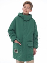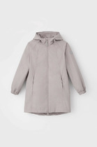 Оригинальный плащ свободного силуэта с асимметричной застежкой молнией выполнен из легкой водоотталкивающей ткани. Модель выделяется обилием необычных элементов, таких как комбинированная конструкция центральной застежки, которую частично закрывает клапан на пуговицах. Декоративные пуговицы использованы также в застежке капюшона. Плащ отвечает всем параметрам, характерным для детской одежды, отлично стирается и быстро сохнет.