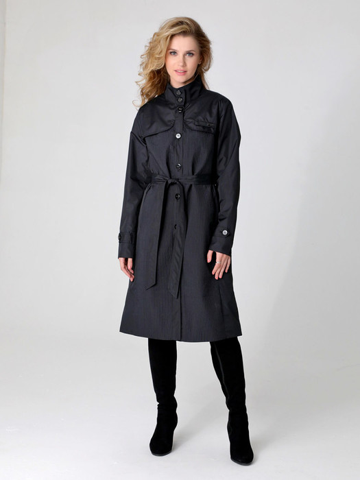 Легкий весенний плащ прямого силуэта с втачными рукавами подходит для девушек и женщин разного возраста. Застежка - на петли и пуговицы. Воротник - стойка. Карманы расположены в рельефных швах. Есть внутренний кармашек. Подчеркнуть линию талии можно с помощью съемного пояса. Плащевая ткань имеет водоотталкивающую пропитку, которая выдержит небольшой дождь и легкий ветер. Подкладка в этом  весеннем плаще выполнена из ткани в мелкую полоску.  Аккуратная стойка, отлетные кокетки и гофрированные вставки определяют элегантный стиль плаща. Выбирайте классический черный или светло-бежевый цвет и встречайте новый весенний сезон модной и элегантной!