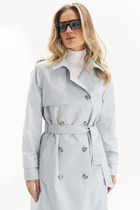 Плащ актуального прямого силуэта, выполнен из плотной экокожи с тиснением. Воротник пиджачного типа с отложными лацканами. Двубортная застёжка на петли и пуговицы. По плечевому шву обработаны погоны. Спереди отлетная кокетка и наклонные карманы с листочкой. Рукава кроя реглан, с патами по низу, с фиксацией на пуговицы. Спинка со средним швом. Для удобства движения сзади обработана шлица. Тренч на подкладке. В комплекте пояс из основной ткани с пряжкой.