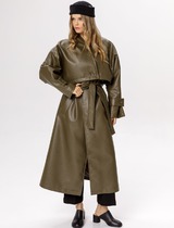 Плащ женский полуприлегающего силуэта предназначен для повседневной носки. Перед с двумя нагрудными вытачками, с двумя отрезными бочками, в швах их соединения с передом обработаны карманы. Спинка со средним швом, заканчивающимся шлицей. Горловина круглая, с втачным воротником с отрезной стойкой. Застежка центральная двубортная на 14 пробивных металлических кнопок. Рукав втачной, двухшовный, длинный, низ рукава с тремя настрочными шлевками, в которых держится хлястик из отделочной ткани, закрепленный в пряжку. Плащ с плечевыми накладками. Плащ на притачной подкладке по низу. К плащу прилагается съёмный пояс из отделочной ткани с пряжкой. Плащ со съемным жилетом, длиной до линии лопаток. Перед с нагрудными вытачками и одним настрочным прямоугольным клапаном слева. Спинка цельнокроеная. Горловина, проймы и низ обтачные. Жилет на подкладке без застежки. К плащу крепится на пуговицу на горловине спинке плаща под воротником. Длина плаща 116 см. Длина рукава 61 см. Длина жилета 36 см