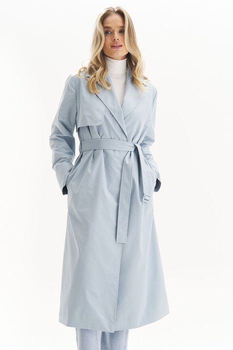 Плащ женский, прямого силуэта, из плащевой ткани, на подкладке, со смещенной относительно центра переда застежкой на 3 пришивные кнопки (размер и цвет фурнитуры может незначительно отличаться от фото), со съемным поясом из плащевой ткани и пряжкой. Плащ предназначен для повседневной носки.