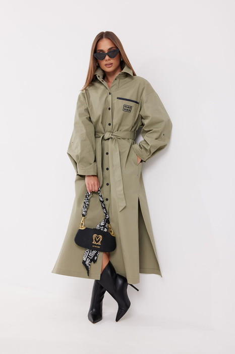 Плащ женский, свободного силуэта без подкладки. Воротник отложного типа. Рукав широкий спущенный с патой. В боковых швах карманы и высокие разрезы. Застежка на кнопки. По левой части переда накладной карман с вышивкой.