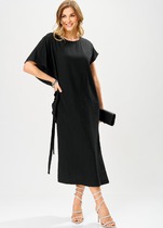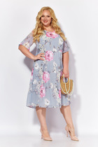 Синее платье из вискозы. Короткие рукава, общая длина до середины бедра. Принт в виде птичек и растительных узоров, полосатые вставки. Размеры от 42 до 52. Есть возможность заказать данный товар по розничной цене.