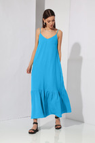 Платье на подкладке, отрезное по линии талии, степень прилегания фиксирует эластичная тесьма, с разрезом по среднему шву спинки и застёжкой на навесную петлю и пуговицу. Перед с нагрудными выточками. Спинка со средним швом. Рукава втачные, одношовные, короткие, книзу расширенные. В дополнении ремень.