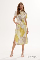 Платье А- образного силуэта, на подкладке. Перед с нагрудными выточками. Спинка со средним швом с разрезом и застёжкой на навесную петлю и пуговицу. Рукава втачные, одношовные, короткие.