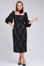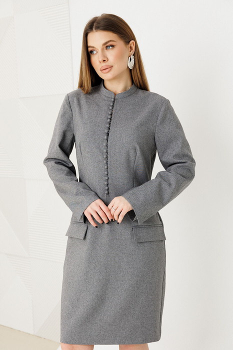 Платье женское приталенного силуэта, выполнено из костюмной ткани. По переду имитация застежки на петли-пуговицы, воротник стойка, на рукавах шлицы, по спинке застежка на молнию. Изделие на подкладке.