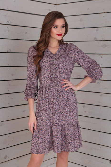 Платье женское, отрезное по линии талии с лёгкой сборкой. К низу притачной волан. По переду платья вокруг горловины и по планке - воздушный шифоновый волан с ажурными пуговицами. Рукав книзу присобран на резинку-венгерку.