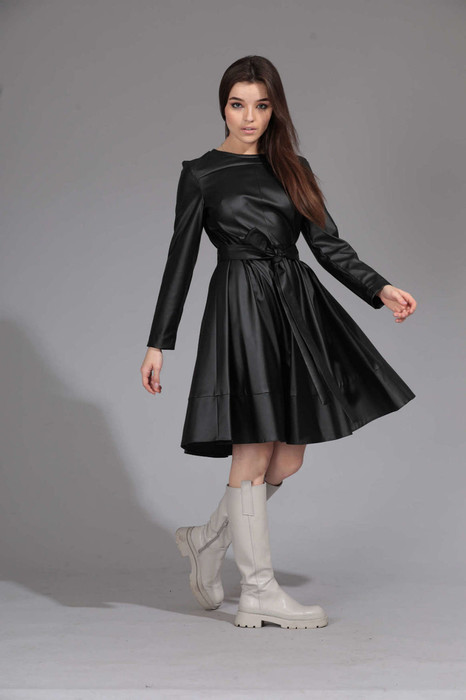 Игривое кожаное платье на натуральной хлопковой основе, что дает приятные и экологичное прилегание к телу.